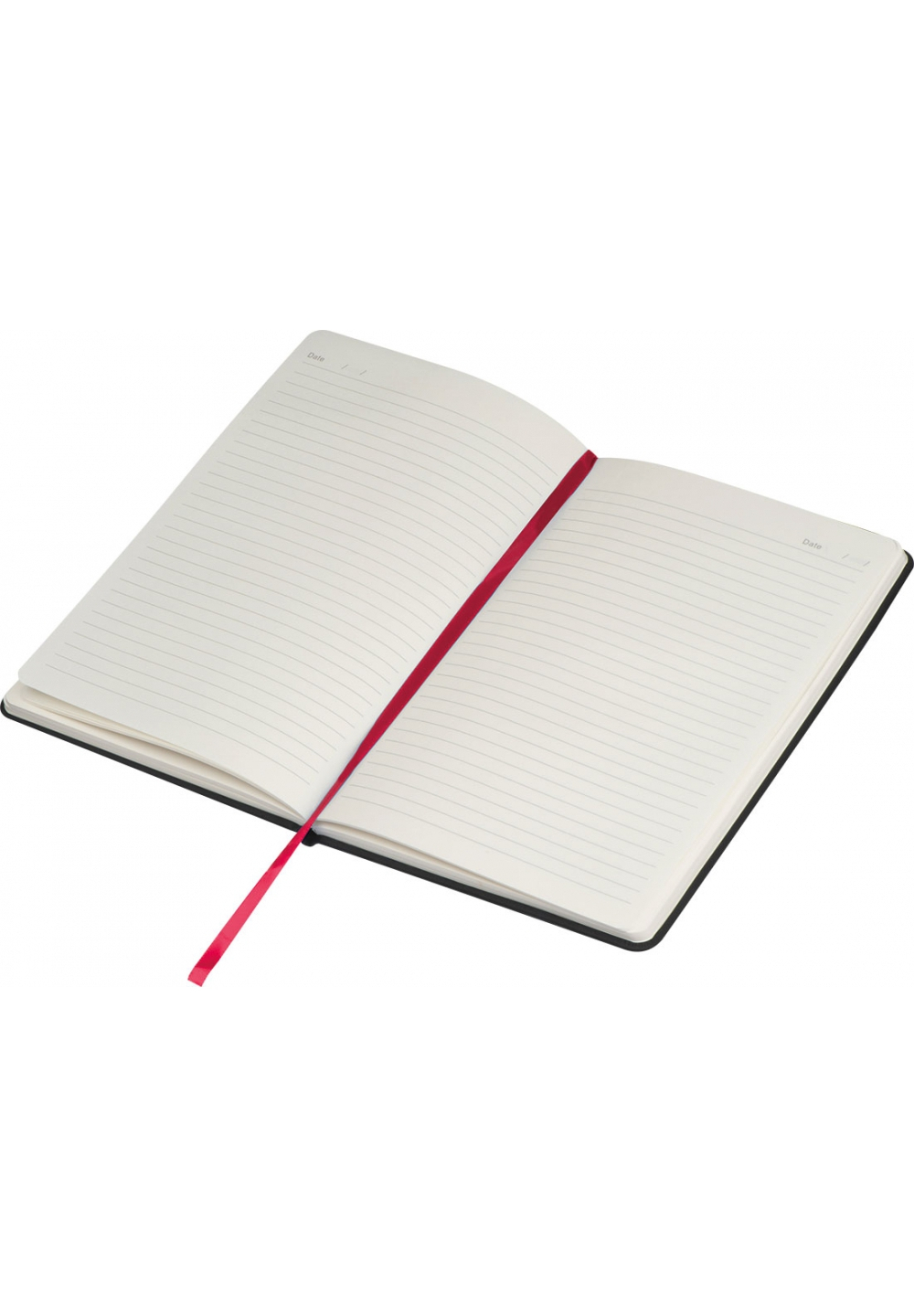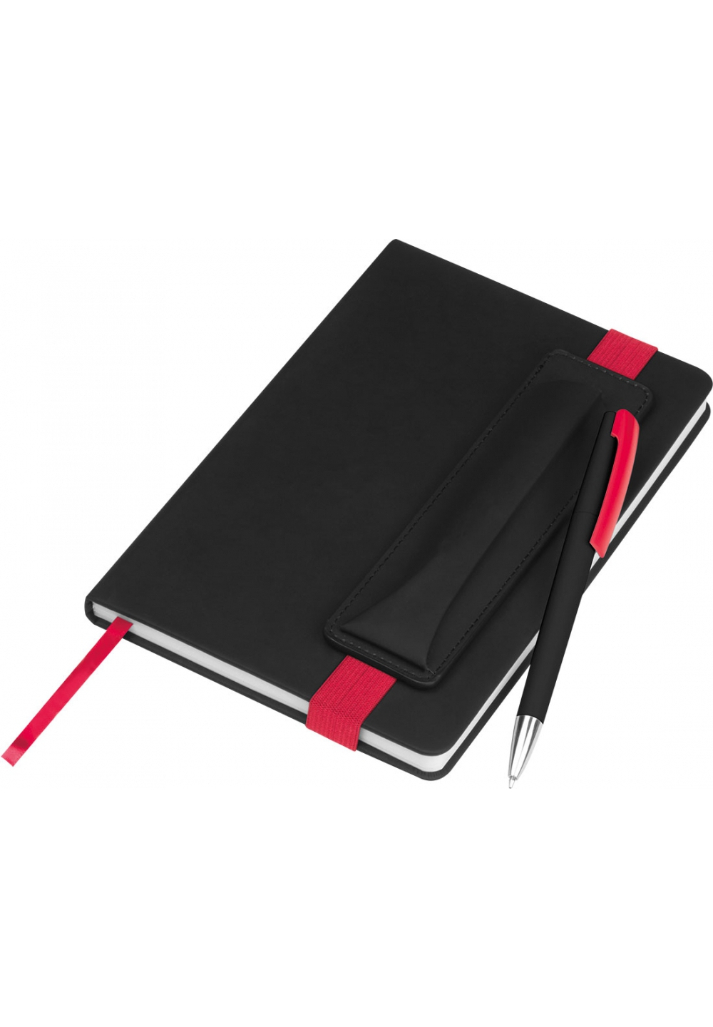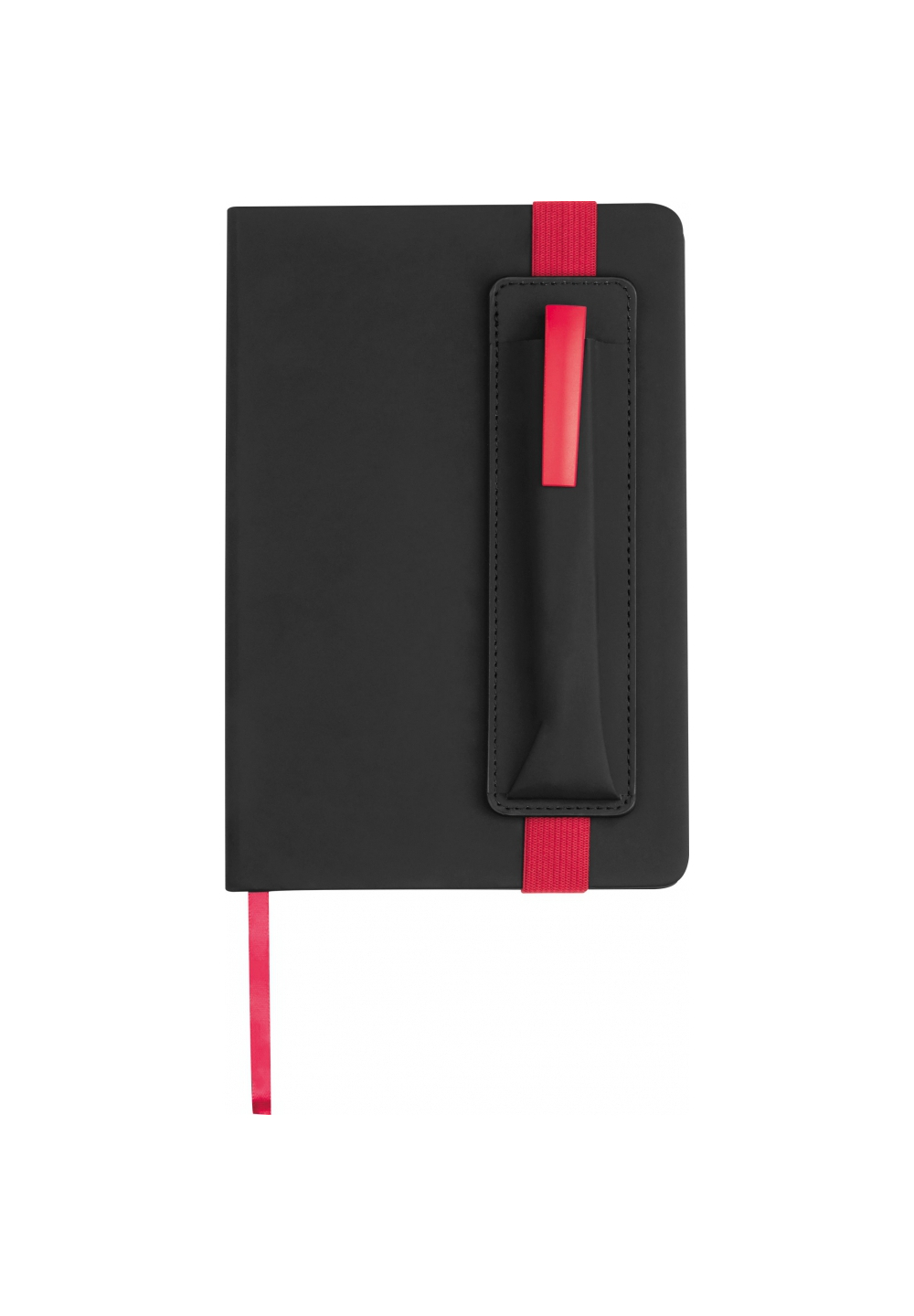 Czarny notes reklamowy z zamknięciem na gumkę i miejscem na długopis. Notes jest w rozmiarze A5, który jest szczególnie lubiany przez klientów. Notesy reklamowe w tym modelu można oznakować przy pomocy tampodruku.